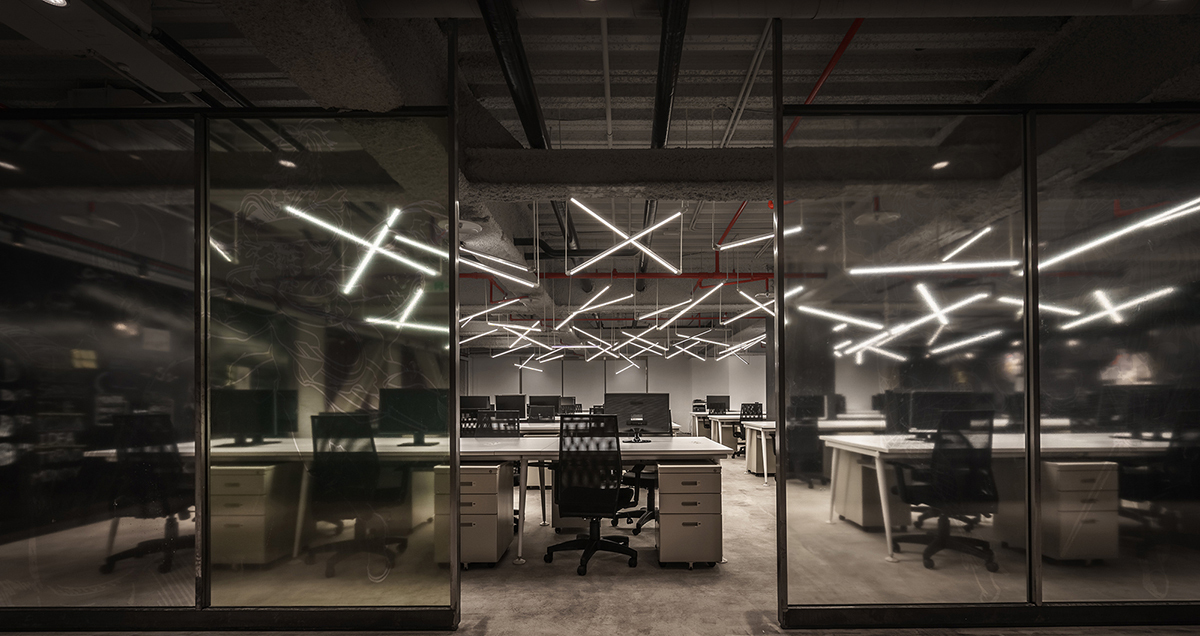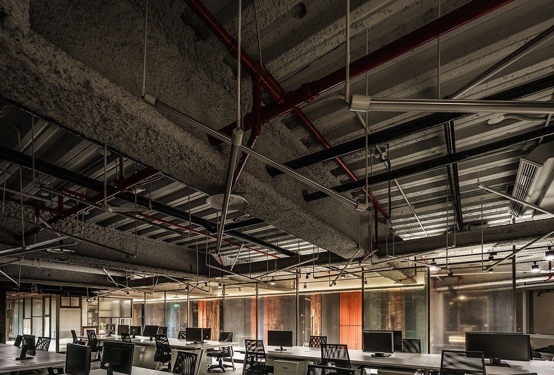 辦公室裝修設計公司讓空間內以一種富于能量的形式展開,于主動線拉出一道長達20米的廊道,并以開放、穿透的手法讓點、線、面與軸線在此匯聚,形構空間張力與視覺沖擊。